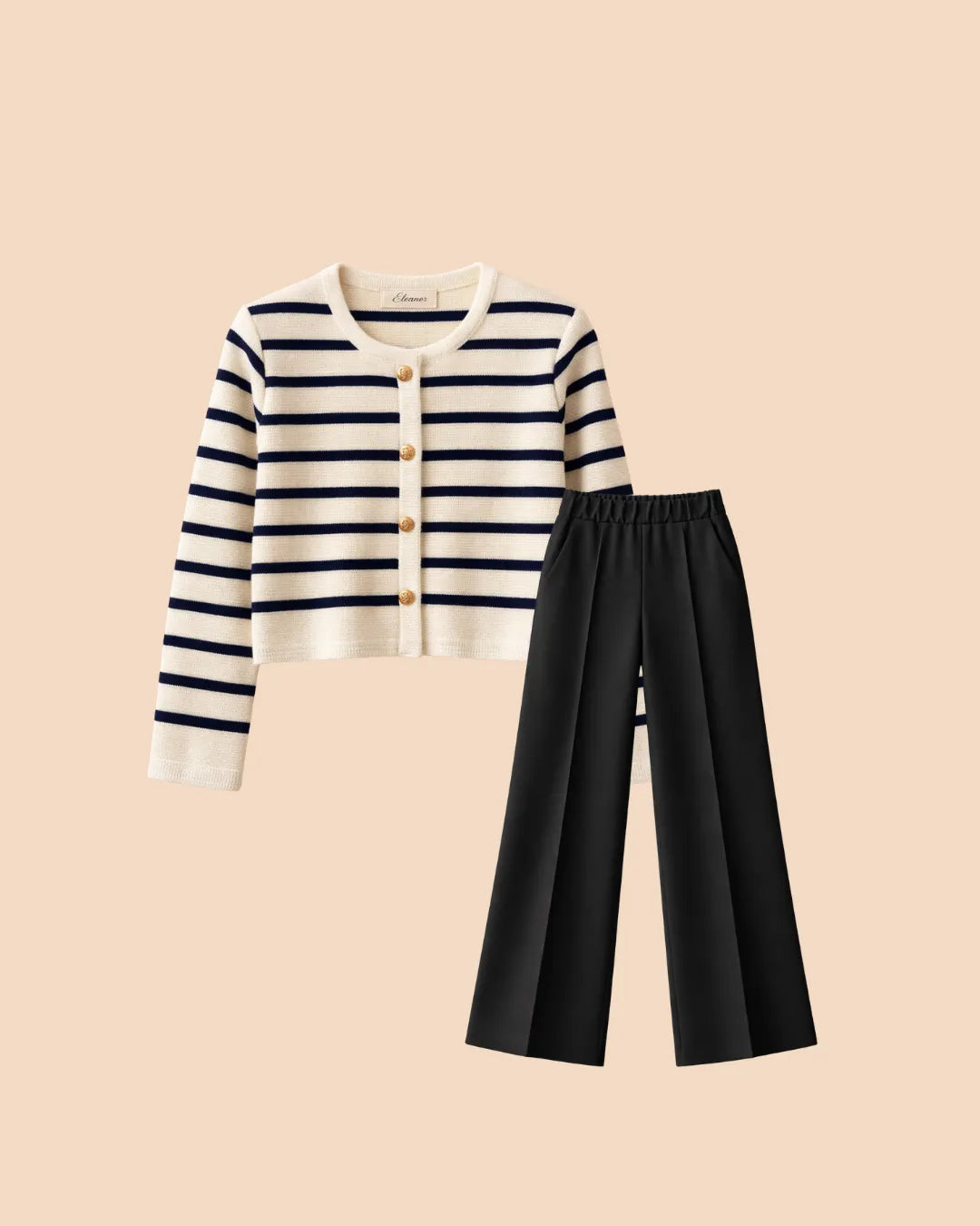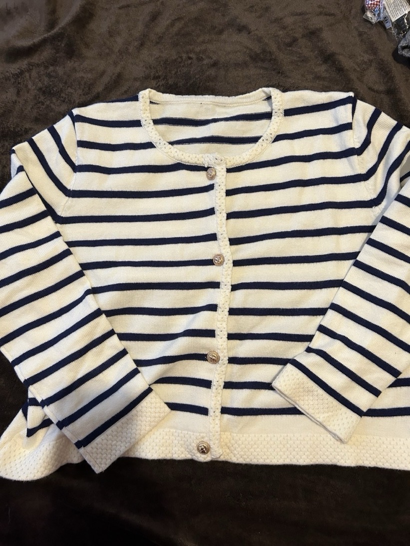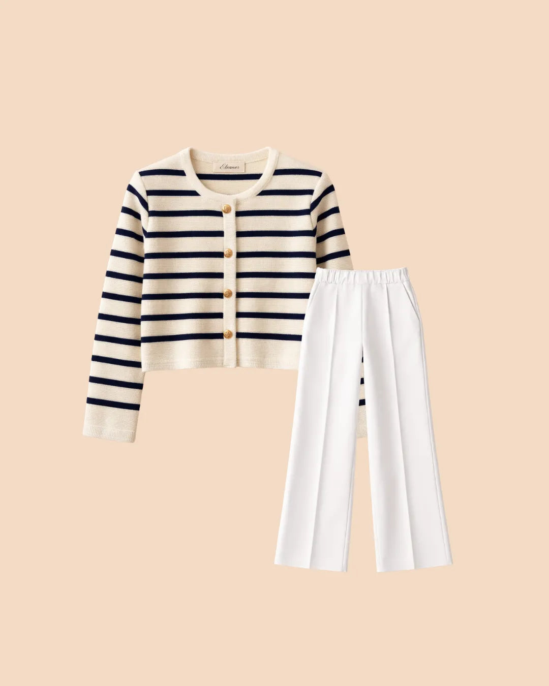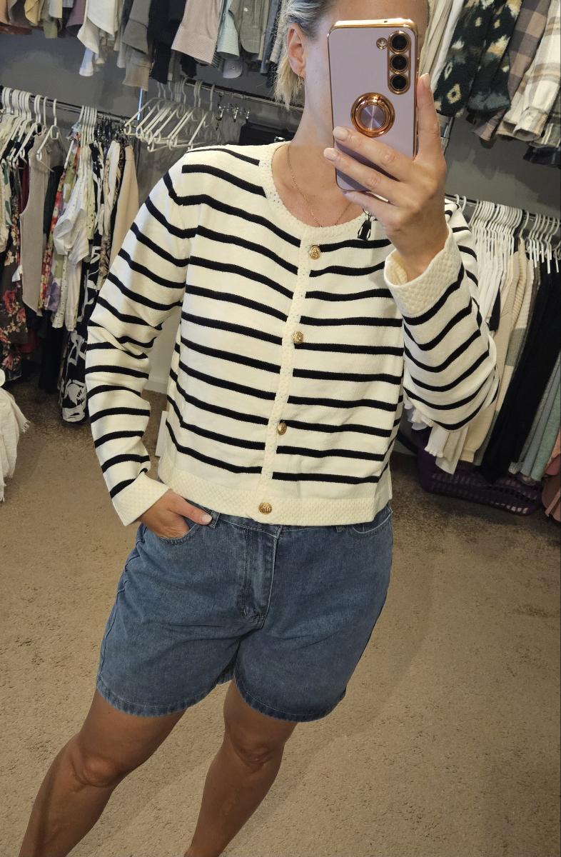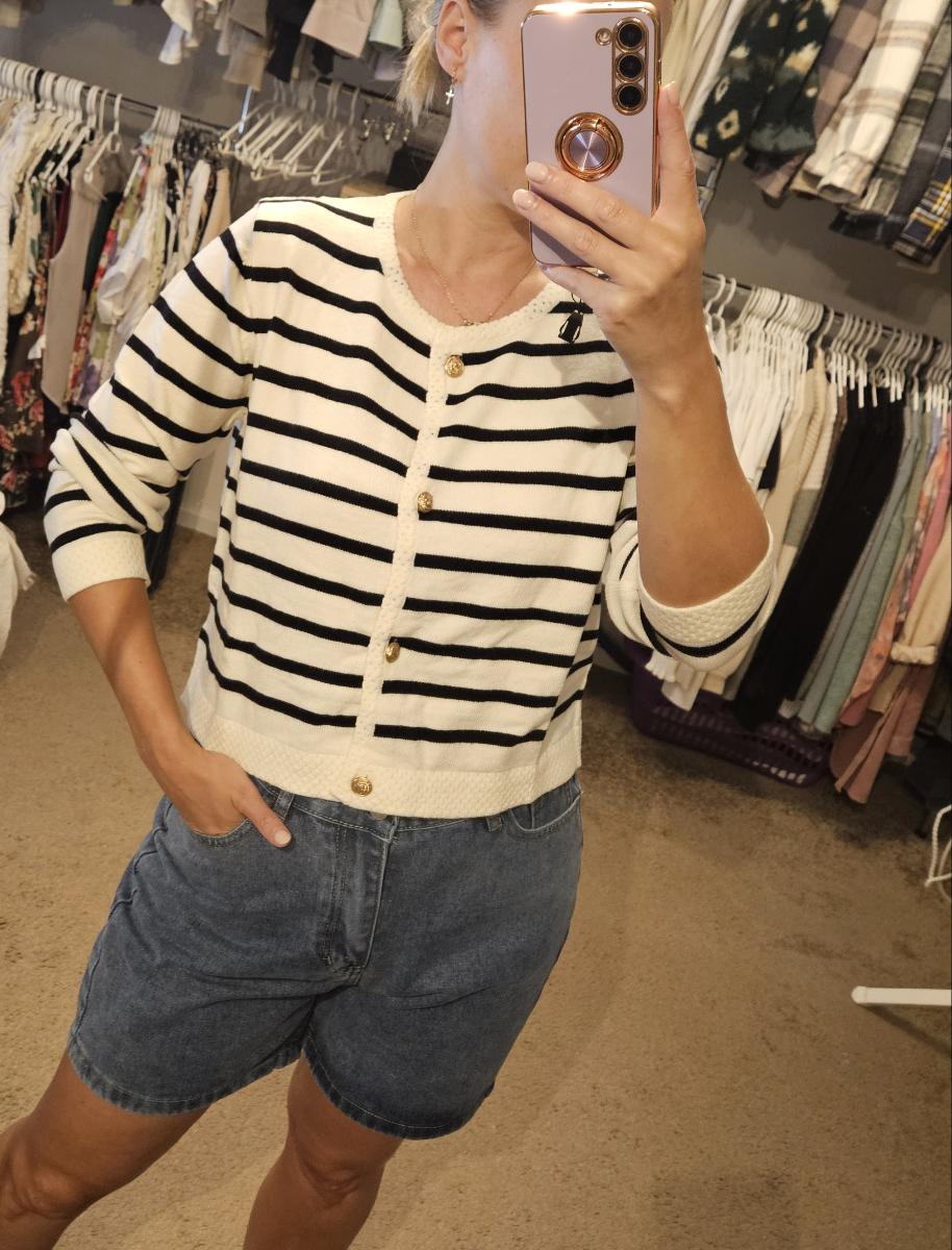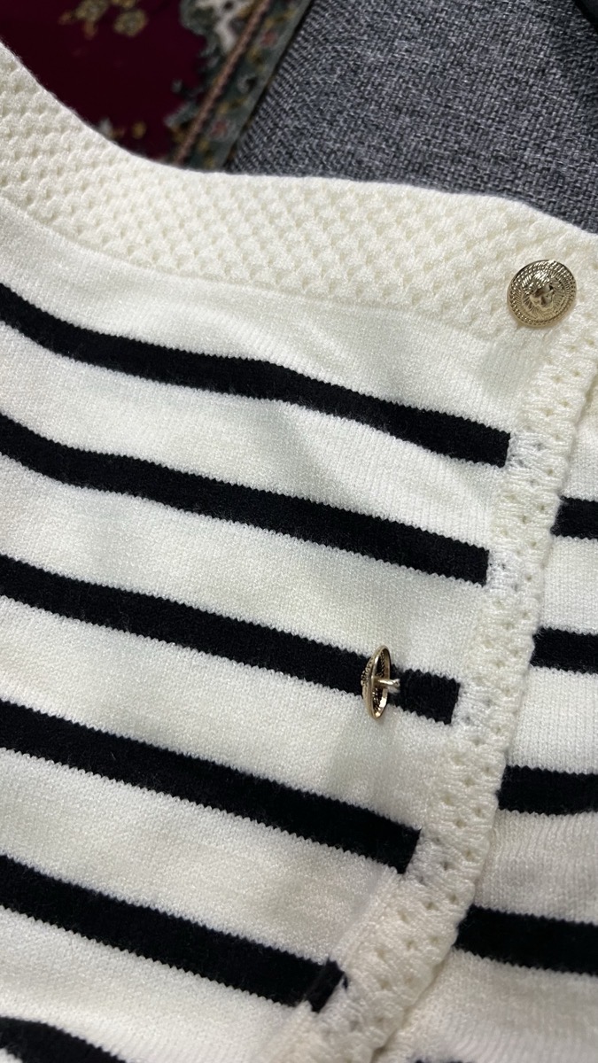 The set features a classic striped knit cardigan designed in a soft cream base with deep navy horizontal stripes, offering a subtle French-inspired aesthetic. Crafted from lightweight, comfortable fabric with excellent shape retention, it provides warmth without bulk—perfect for layering across seasons. The cardigan is finished with a clean round neckline, long sleeves, and a flattering cropped silhouette that gently defines the waist. Four gold-tone buttons add a polished, luxurious touch, elevating the overall look.