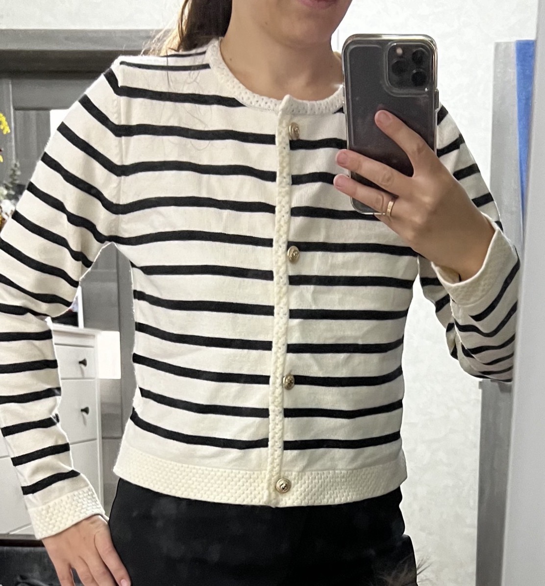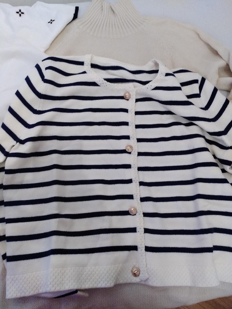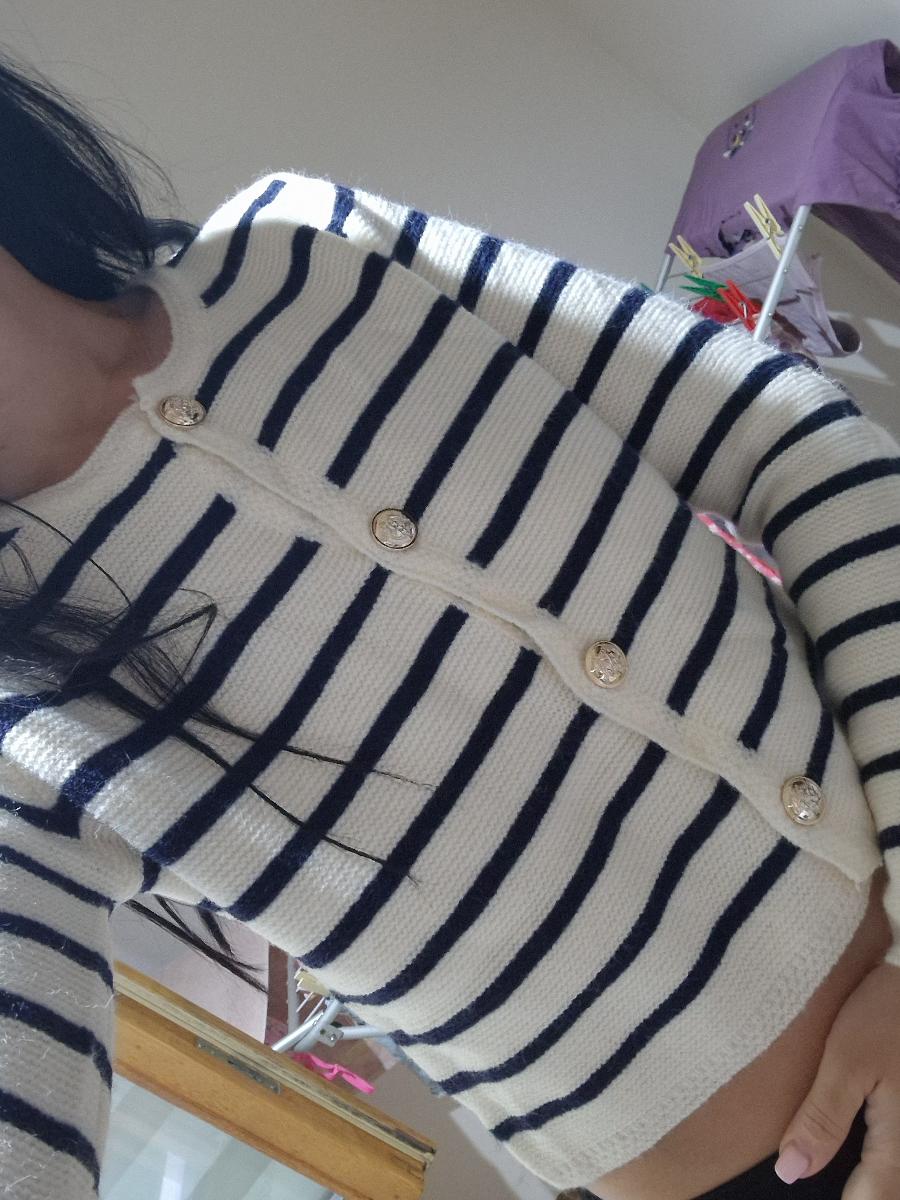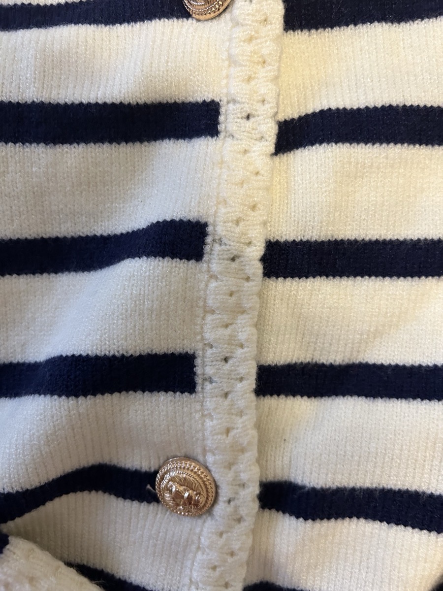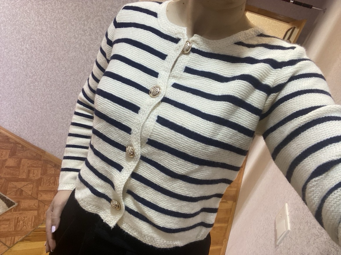 The set features a classic striped knit cardigan designed in a soft cream base with deep navy horizontal stripes, offering a subtle French-inspired aesthetic. Crafted from lightweight, comfortable fabric with excellent shape retention, it provides warmth without bulk—perfect for layering across seasons. The cardigan is finished with a clean round neckline, long sleeves, and a flattering cropped silhouette that gently defines the waist. Four gold-tone buttons add a polished, luxurious touch, elevating the overall look.
