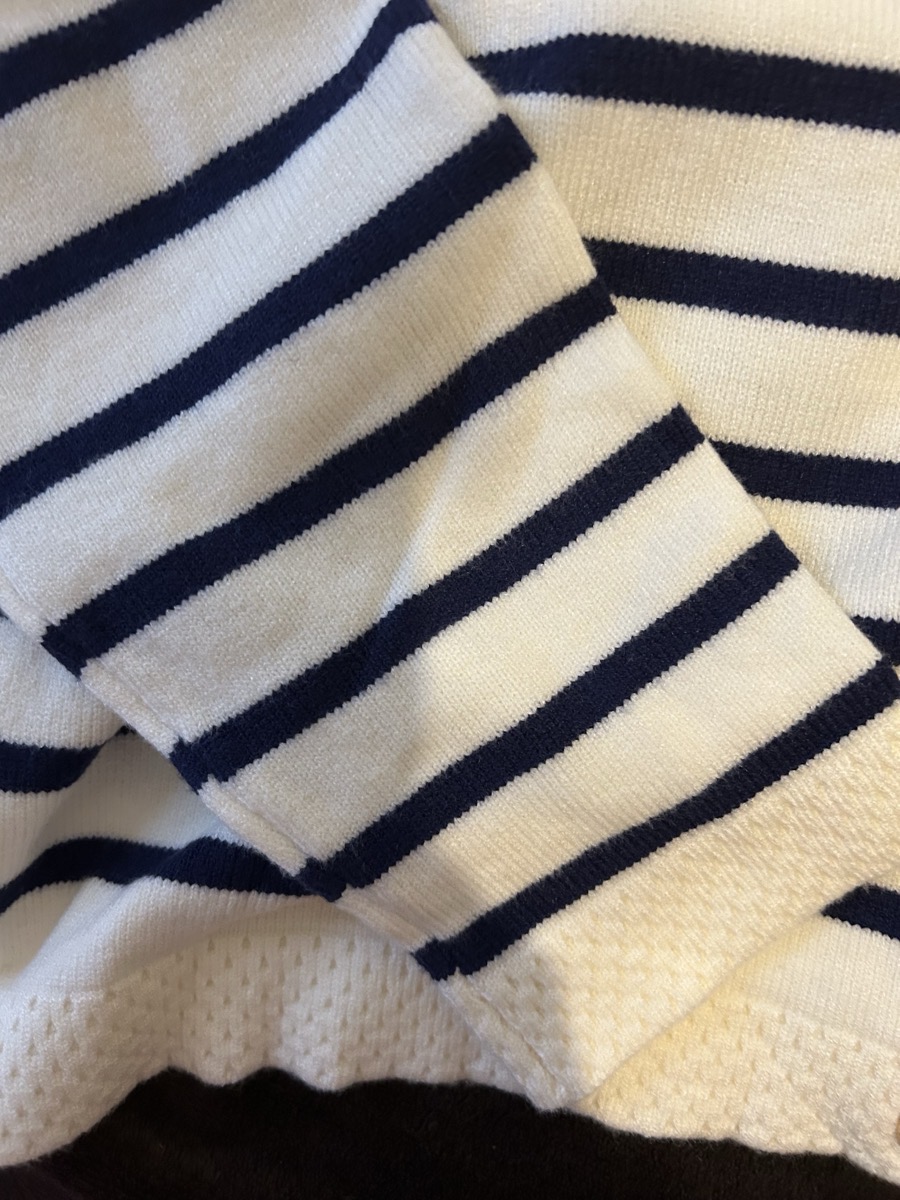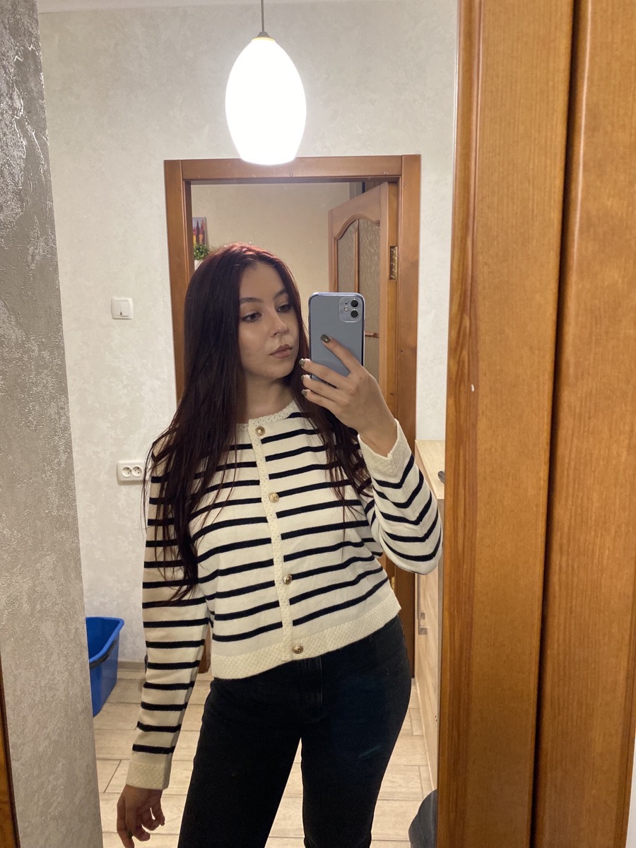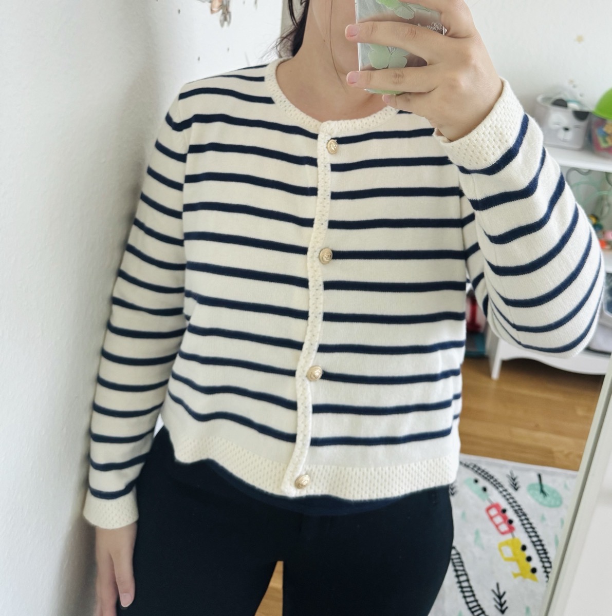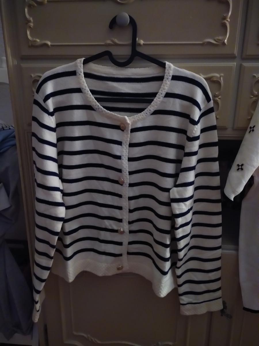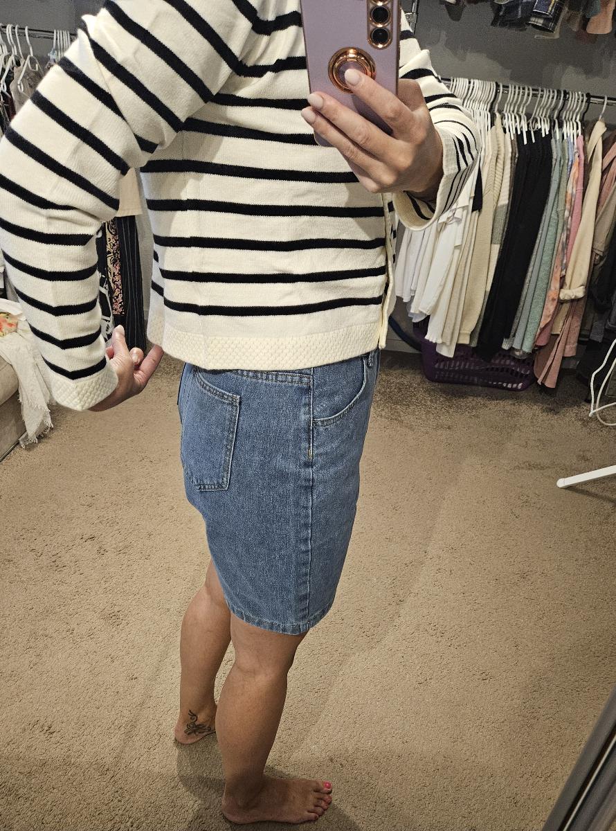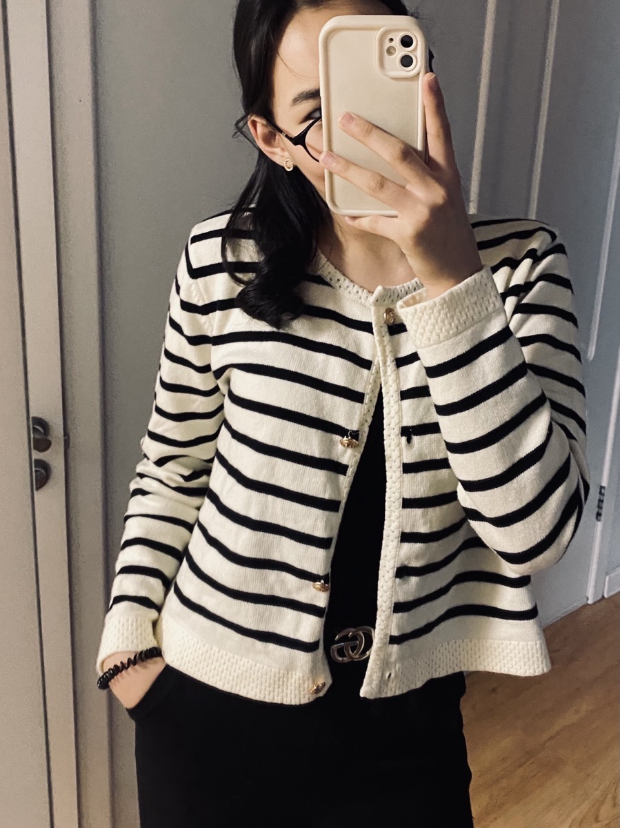 The set features a classic striped knit cardigan designed in a soft cream base with deep navy horizontal stripes, offering a subtle French-inspired aesthetic. Crafted from lightweight, comfortable fabric with excellent shape retention, it provides warmth without bulk—perfect for layering across seasons. The cardigan is finished with a clean round neckline, long sleeves, and a flattering cropped silhouette that gently defines the waist. Four gold-tone buttons add a polished, luxurious touch, elevating the overall look.